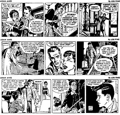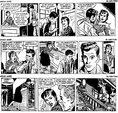 But it was only recently I found out he did another newspaper strip from 1959 to 1962, called Adam ames. Aldam Ames was a beautifully drawn soap opera strip in the tradition of The Heart of Julia Jones. Beautifully drawn and compelling stories, it doesn't surprise me that the good folk at Classic Comics Press (who do the great Julia Joes and Marie Perkins series) were hoping to do a reprint of that strip as well. Alas, the strips would require quite some restoration work and they e-mailed me it would be some time in the future before we see those. Which leaves me free to show you some lesser quality, but still very pretty samples myself.
