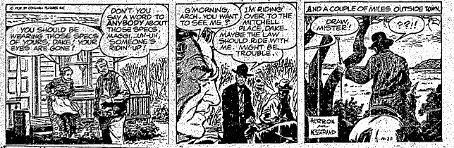 The second month of Howard Nostrand's three month stretch on Bat Masterson. Neal Adams has said that this was the first thing he worked on, as Nostrand's assistant. But don't expect to see any of his typical stylistic features. He wasonly starting out and very, very young. Despite the graininess, these are the best available copies of these strips. The line quality in these is so, that you can read and follow the story, for which you will have to follow the link to see the beginneng and return next week to see the end.