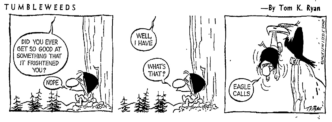 Tumbleweeds was a typical example of the early sixties sarcasm genre, if slightly late. The strip didn't start until September 1965 and hit the ground running. Some strips had to wait years to find their forte, but T. K. Ryan seems to have foun dit immediately. I think he hurt himself badly when he started using a typeletter font in the nineties or so. All at once the gags seemed to be cookie cutter as well, although there was nothing wrong with them.