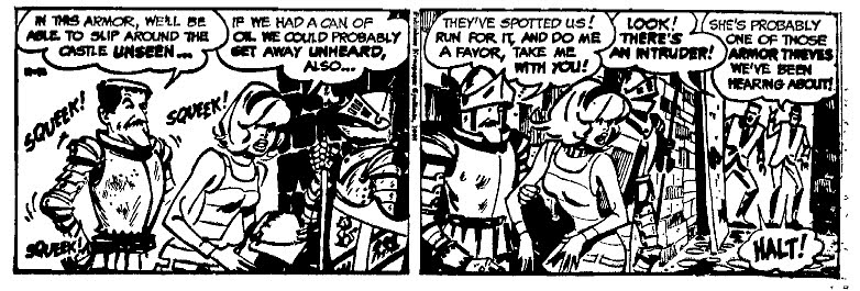 Most of the Mad artists tried their hand at newspaper strips at some time. Some are better known than others. Al Jafee's Tall Tales was a moderate succes. Mort Drucker's political strip got a bit of attention. Jack Davis didn't do bad for himself. Don Martin's post-Mad newspaper efforts have been reprinted by Dark Horse. But there were others. And probably more than I am aware of. Paul Coker did at least two attempts at a newspaper gag strip. Bob Clarke worked on a satirical panel with a writer (whch I will show some other day). And jack Rickard did a funny adventure strip which I can only describe as a cross between Get Smart and the later comedy series Soap. Pauline McPerill told the (mis)adventures of a blondhaired secretary, who gets kidnapped and tied up and saved by her boyfriend over and over and over again. It's not so much funny as it is over the top. But artwise it is pure Jack Rickard and what qualifies it for a turn here is the fact it has remained so u known all these years. As has the comic book work of Mort Drucker, Angelo Torres and George Woodbridge. Or the illustration career of Norman Mingo. Or the cartoon background of Duck Edwing. Or the life and sudden disappearance of Harry North.