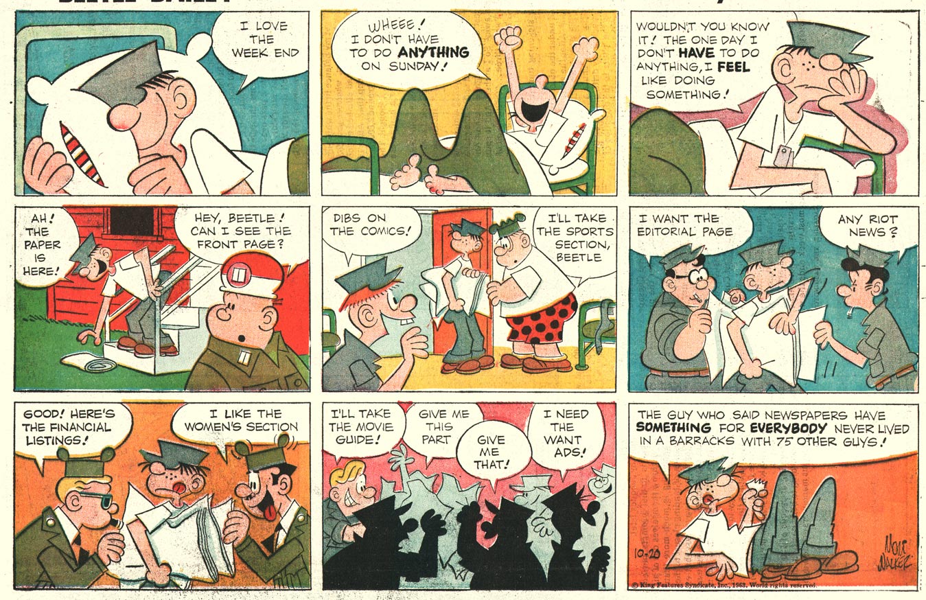 Going through my scan files I saw I have not shared any Sunday Beetle Bailey strips with you lately. And I have quite a few. I will start today with the later samples, all still from the 'good years'. Next week, I will have a few from 1952/54. All this is in honor of Beetle's 60th year in the army. He enlisted on March 13 1951, after having tried his luck as a civilian for half a year.