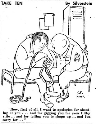 Shel Silverstein was a great cartoonist and songwriter. I know him best from his Playboy work. The recetn book of his Playboy cartoon essays and tevelohues is a must-have. What I didn't know was, that he started life as a cartoonist in the army. When he was stationed in the East in 1954/55 he drew a regular cartoon for the Pacific Stars and Stripes. Or at least, I guess he was stationed there. There is very little te be found online about this period, except a small item at the Stars and Stripes site reprinting some of the cartoons. They state he was there from 1953 to 1955, but they open with the same cartoon from July the 6th, which was the first one I could find. On the other hand, he seems to have done some illustration work as well (I managed to run across two of them), so that may have started earlier.