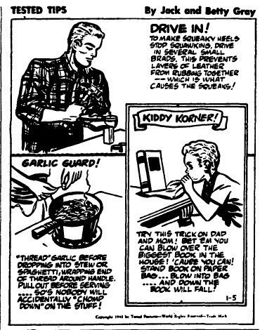 Followrs of this blog will know there are two things I like above all: odd strips or panels and artists influenced by Milt Caniff. So here is one 1948 panel that combines both. Tested Tips by Jack and Betty Gray is similar to Know Your Mind in that it seems to be some sort of women's magazine feature and it is drawn is a sort vague Caniffy style. Like Know Your Mind, the artis doing the illustration does not seem to have signed his work. I know there are two names on this panel, but I don't tink either Jack or Betty Gray are the artist. MY reasons for thinking this are threefold. First of all, I do not know of an artist called Jack or Betty Gray doing Caniff style artwork. Secondly, two years into the feature, the artist seem to have been replaced, without the names on the feature changing. And thirdly, I strongly suspect that this panel is the work of later Judge Parker artist Dan Heilman. Before Heilman did Parker, he worked on a strip called The american adventure, which I have shown here (and will again, since I have almost all of the Sundays - it's just a matter of clipping the dailies to go with it). The art here shows remarkable likeness to that work. If Heilman was the artist, he must have worked on bot features for a short while. The Amerikcan Adventure started somewhere in 1949 and the artist change on Tested Tips didn't come until early 1950. Still, I have seen most of the Caniff influenced artists from this period and Heilman is the closest fit.