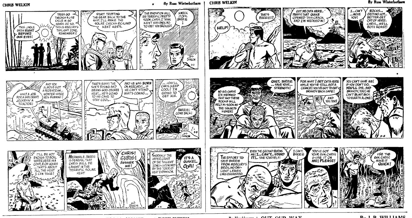 On the ilovecomix website there is a long run of Chris Welkin, Planeteer from Roy Thomas' private collection. I thought they only had the first few months (with a nice recollection by Roy), but on loking back they actually have all of the dailies from 1951 to 1954. After that, this remarkable strip by the later Born Loser artist Art Sansom was continued as a Sunday only strip. I will try and show more of those later on. But for now I have a large run of dalies of this strip from early 1953 to the end in 1954. And if you want to see them all (in an even better condition) you can go to www.ilovecomix.com.
