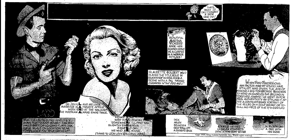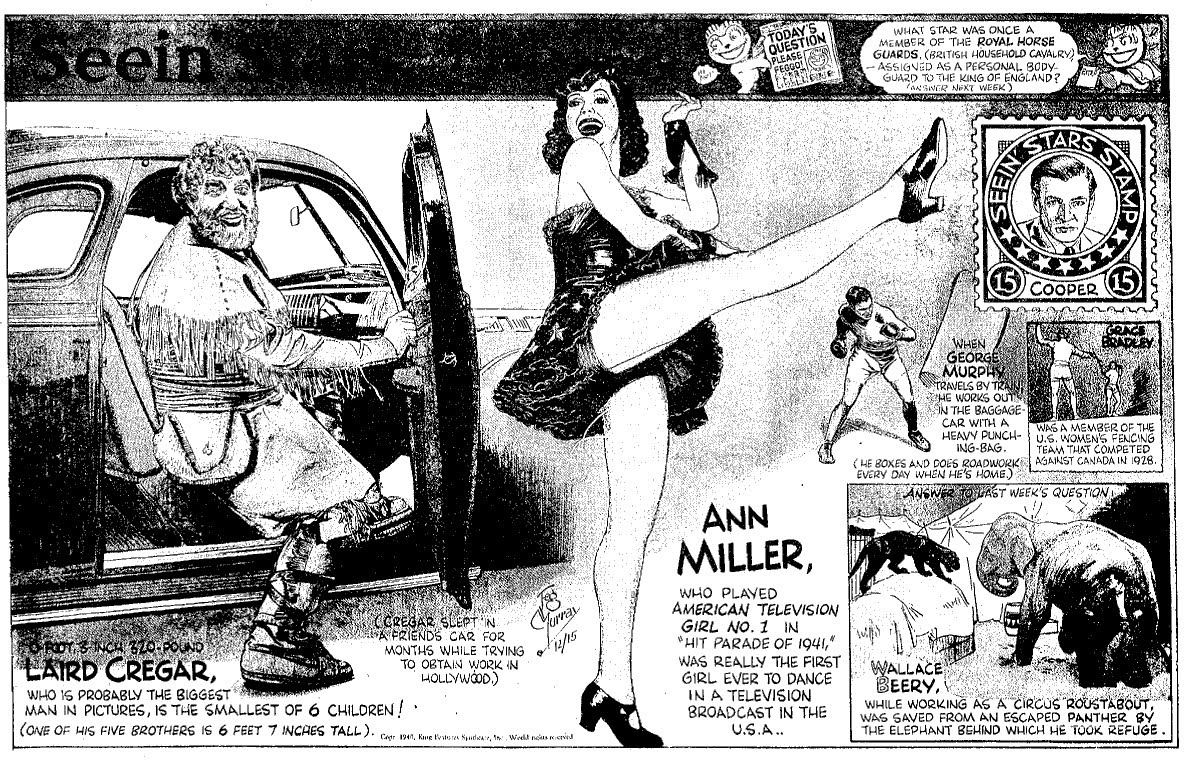 Feg Murray was an Olympic hurdler, who took to cartooning in the 1920's. In 1936 he started the feture he was famous for, called Seein' Stars. It was a gossipy variation on the Belive it or Not format, with beautiful artwork by Mr. Murray hmself. In the ate thristies he became some sort of a minor celebrity himself, appearing on radio as some sort of gossip expert and probably even presenting his own program. I will have to look into that. Since I am concentrting on scanning stuff from the late fifties now and he stopped doing Seein' tars in 1951, I only have black and white scans for now. But an impressive lot it is. He sdoes not seem to have depended on ghost artists much, or at least the style remains solid all through the run. And even if he had help, remember he did this daily and Sunday for over 15 years...