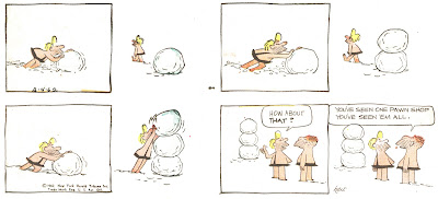 Every couple of month I gather all my B.C.'s and share them with you. Still one of my favorite comic strips ever. The gags, the characters, the animation. It's a shame this classic isn't collected the way it derserves. At least here you can click and read them out of order. Doesn't matter, though. The first ten years I show here are all equally good. In fact, even though I don't often scan later samples, when I see them it always surprises me how good the strip remained into the nineties. Especially the Sundays. When the dailies were losing their graphic superiority, evolving more and more into a series of non moving verbal sarcastic gags, the Sundays always remained graphicly interesting. Fans of cartooning and animation should be able to study them.
