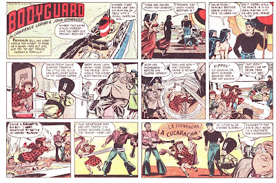 Following the career of John Spranger, here are some more Bodyguard Sundays. Before this, Springer had been Will Eisner's main penciller on the Spirit and it shows. In the fifties he would take over The Saint and simplify his style. In these gorgeous Sundays of Bodyguard, Ben Friday and The Bantam Prince, you will see his progress. For earlier samples of this strip written by Lariar (somebody tell Bill Griffith) click the link.