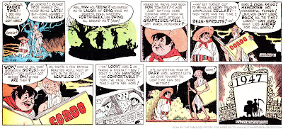 So how about a little early Gordo for the weekend? Gordo started in 1941 but was dialed down to a Sunday only strip wheile Gus Arriola was in the army. After the war, the Sunday strip slowly went from storyline based to gag based. In this early run from 1946, you'll see a lot of Arriolas later tropes being introduced. You can also see, how he let his love of jazz influence the subject, content and writing style.