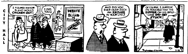 I have shown more of the late fifties/early sixties strip City Hall. It was written by Donoby and drawn by Will-Yum artist Dave Gerard (with Donohy taking over solo in the last years). But I have never found many color samples, which is why I was very pleased two turned up in a recent buy. City Hall fits the satirical mood of that period, but it also has a healthy dose of slapstick and character. At least now I n[know which Paper I need to get complete.