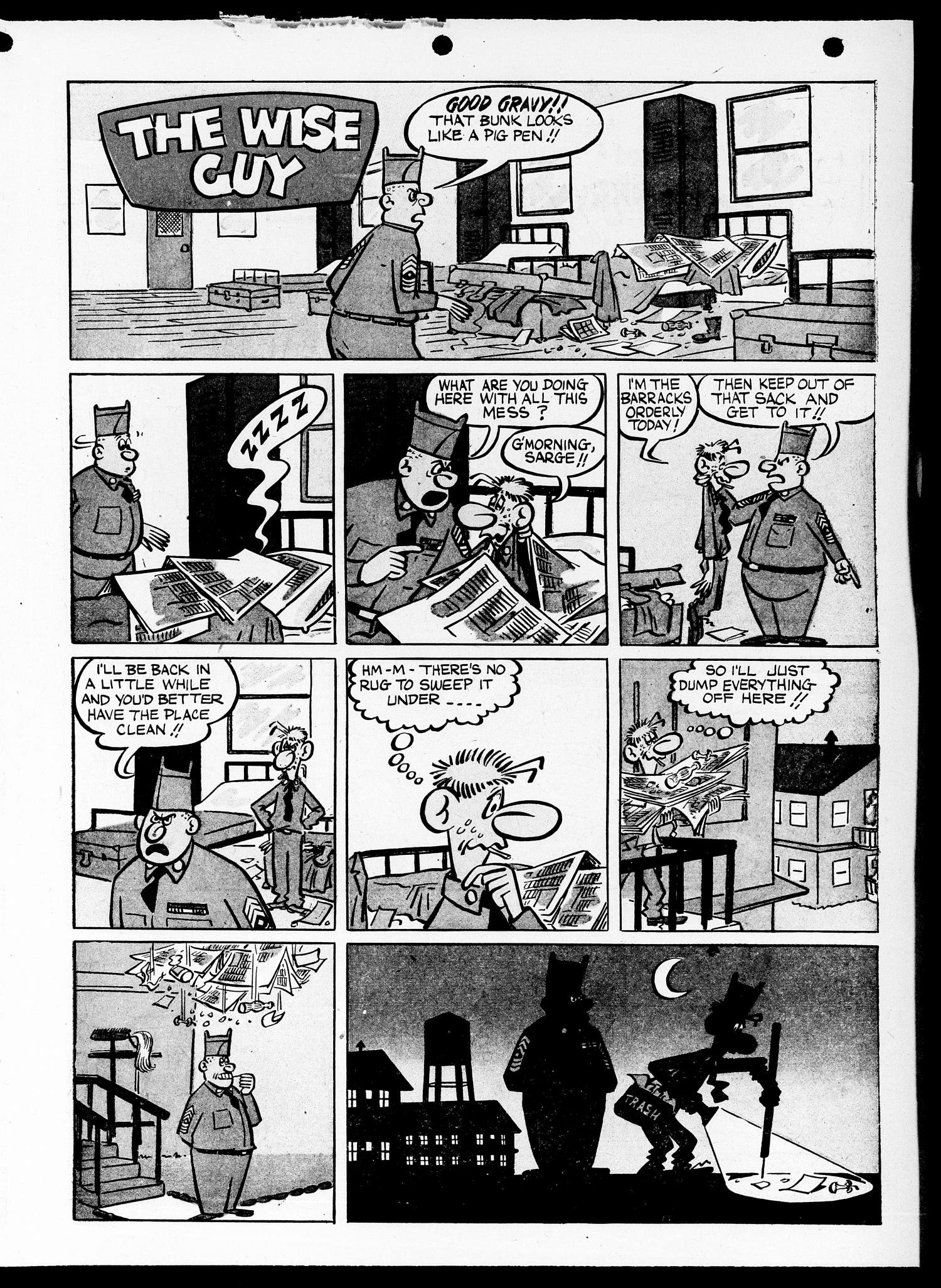 Last week I shared some samples of Jack O'Brien's early sixties daily panel Cool Cat. I mentioned that I think he was a career army man from the early forties to the mid fifties, while building an impressive client list for his cartoons. From 1955 onwards he was also a regular contributor to the American Armed Forces Features. I have shared some of his work from that the pre-made Sunday section for army papers, but not yet his main feature, called The Wise Guy. As far as I can see, he did that strip once a week for over ten years. My sampels are from an internet source that has 1956 and at least two other years missing. Copies are hard to find, so if you have any, please tell me.