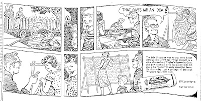 That Gives Me An Idea was a once a week two tier daily ad for Wrigley's Spearmint gum. In both papers I found that ran it, it was published on Tuesdays. The basic set-up was simple and always the same. Someone observes someone (often a kid) trying to solve a problem. He gives that kid a stick of gum and he or she puts it in her mouth in two small panels. Then she solves the problem. The next panel the main character sees someone else with a similar problem and exclaims: That Gives Me An Idea!. That text is spread over this panel and the previous one, connecting them. He then gives the second person (usually an adult in a professional situation) a piece of gum in a lager panel, he or she puts it in his or her mouth in another small panel and then succeeds in doing what they wanted to do. The whole thing is textless, except for the slogan and it is drawn in a nice, comfortable style, reminiscent of the European 'clear line'. As an additional feature, the whole two tiers are shaped in a recognizable wave form, which (along with the rigid format) was kept for whole of the run.