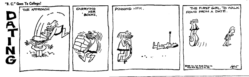 Here is a series of five special strips done by Johnny Hart for a weekly University paper. Or maybe even more of them. They seem to have been done in conjunction with the appearance of the first paperback, 'Hey B.C.'. Interestng way to reach the college crowd. I think I might go and do something similar for the Dutch Mad.